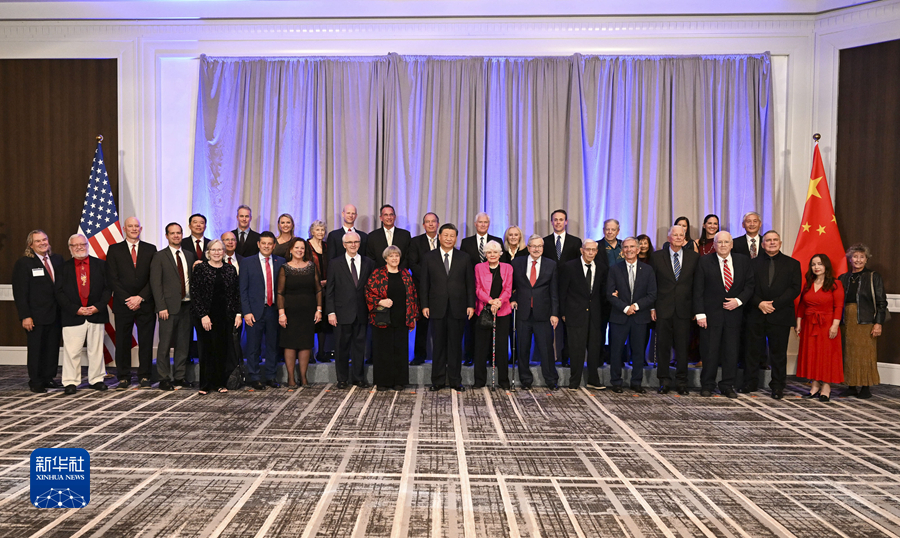 當(dāng)?shù)貢r(shí)間11月15日晚,國(guó)家主席習(xí)近平在美國(guó)舊金山出席美國(guó)友好團(tuán)體聯(lián)合舉行的歡迎宴會(huì)。這是宴會(huì)開始前,習(xí)近平會(huì)見飛虎隊(duì)和史迪威將軍后人、鼓嶺、艾奧瓦州、華盛頓州等方面友好人士代表,同他們親切交談并合影留念。新華社記者 謝環(huán)馳 攝 圖片來(lái)源:新華網(wǎng)