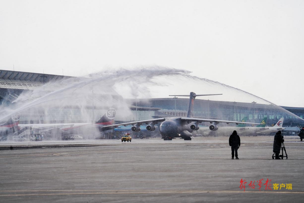 滑行時(shí),兩道水柱從跑道兩側(cè)的消防車(chē)中噴射而出,它們?cè)趻佄锞€最高點(diǎn)相遇,一道“水門(mén)”傾瀉而下,為搭載志愿軍烈士遺骸的運(yùn)-20專(zhuān)機(jī)接風(fēng)洗塵。