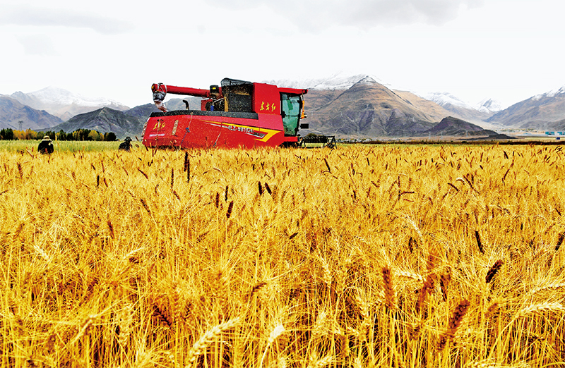 近年來,西藏自治區(qū)積極實施耕地改造,通過開展高標(biāo)準(zhǔn)農(nóng)田建設(shè),全方位提升耕地質(zhì)量與糧食產(chǎn)量,夯實糧食安全基礎(chǔ)。圖為工作人員駕駛農(nóng)業(yè)機(jī)械在拉薩市林周縣曲果強(qiáng)村的高標(biāo)準(zhǔn)農(nóng)田里收獲小麥(2023年10月12日攝)。 新華社記者 張汝鋒/攝
