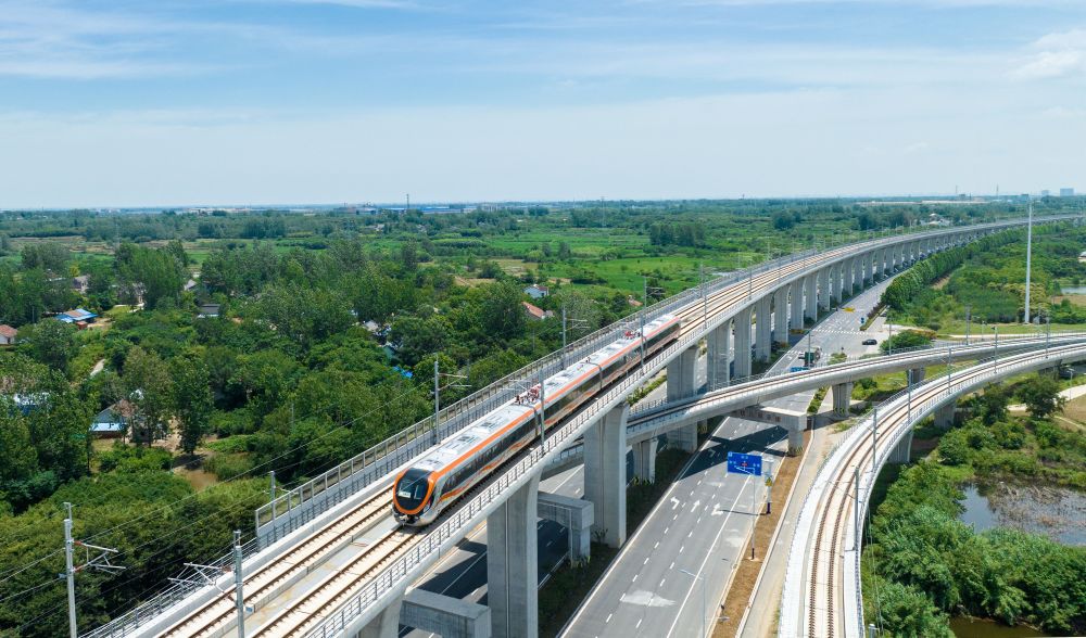 這是在安徽省滁州市來安縣境內(nèi)拍攝的滁寧城際鐵路列車(2023年6月28日攝,無人機照片)。當日,滁寧城際鐵路滁州段開通運營。滁寧城際鐵路西起滁州高鐵站,止于正在規(guī)劃建設中的南京北站,全長約55公里。