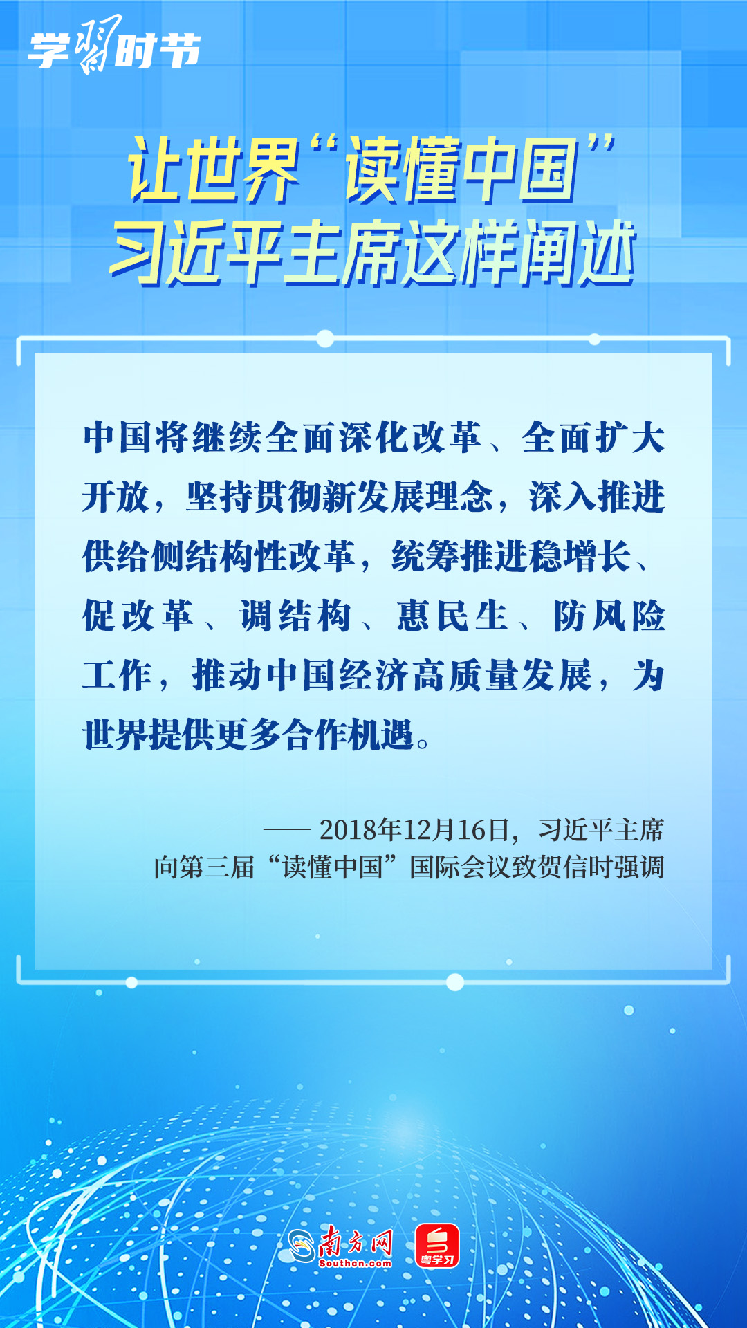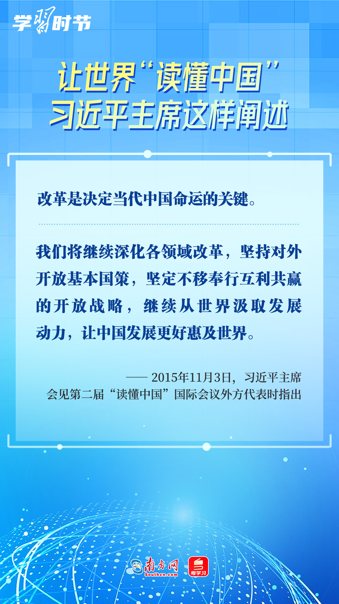 習(xí)近平主席高度重視“讀懂中國(guó)”國(guó)際會(huì)議,多次會(huì)見(jiàn)與會(huì)代表、向會(huì)議致辭或致賀信,闡述中國(guó)的發(fā)展道路、改革開(kāi)放、對(duì)外政策等,讓我們一同學(xué)習(xí)。