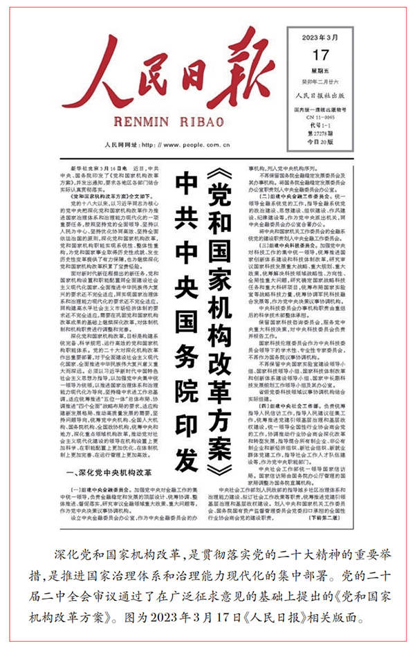 2023年2月,黨的二十屆二中全會審議通過《黨和國家機構(gòu)改革方案》,推動黨對社會主義現(xiàn)代化建設(shè)的領(lǐng)導(dǎo)在機構(gòu)設(shè)置上更加科學(xué)、在職能配置上更加優(yōu)化、在體制機制上更加完善、在運行管理上更加高效。
