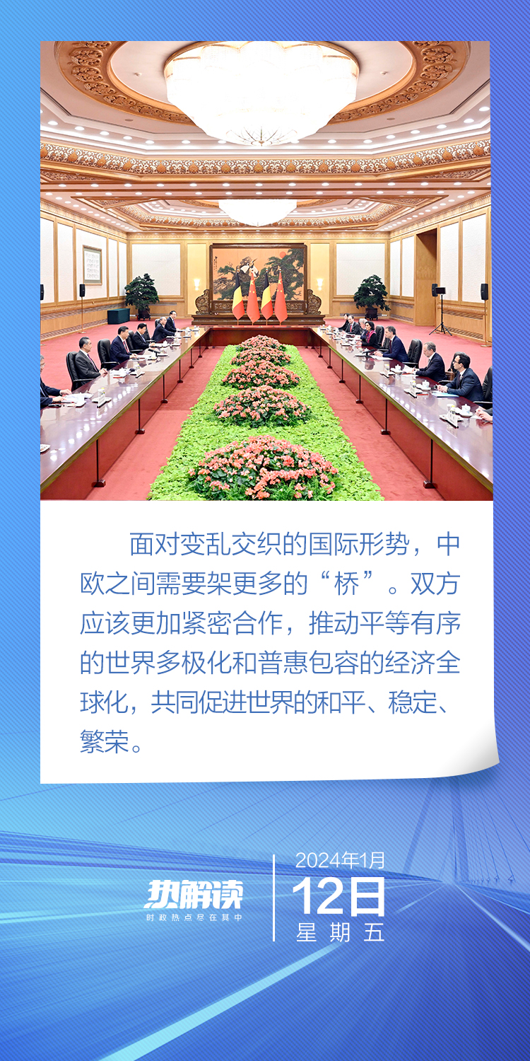 新年伊始,國際形勢變亂交織。具有戰(zhàn)略意義和世界影響的中歐關系,關乎世界和平、穩(wěn)定、繁榮。中歐應該更加緊密合作,共同架設更多的“橋”,為世界提供更多穩(wěn)定性,為發(fā)展提供更多推動力。