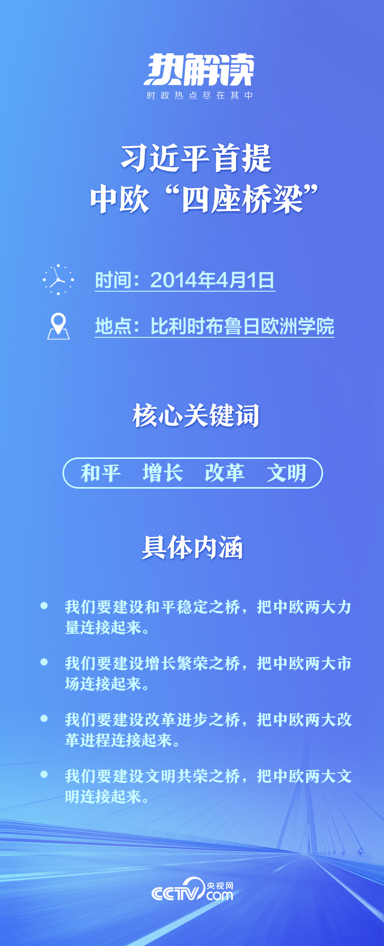 2014年,在位于比利時有著“歐洲政治家的搖籃”之稱的布魯日歐洲學院,習主席發(fā)表重要演講。他借用“布魯日”在弗拉芒語中“橋”的含義,全面闡述中國對歐政策,首次提出中歐要建設“四座橋梁”主張: