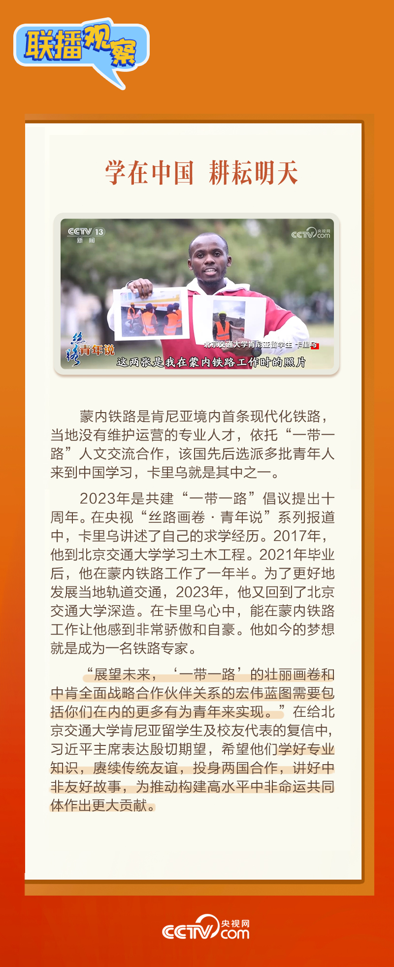 聯(lián)播+日前,北京交通大學(xué)肯尼亞留學(xué)生及校友代表致信習(xí)近平主席,表示非常高興來到中國學(xué)習(xí)鐵路運營管理知識。1月17日,習(xí)近平主席復(fù)信表達(dá)欣慰和喜悅之情,“蒙內(nèi)鐵路是中肯共建‘一帶一路’旗艦項目和成功典范。我高興地看到,你們因這條‘幸福路’與中國結(jié)緣……”