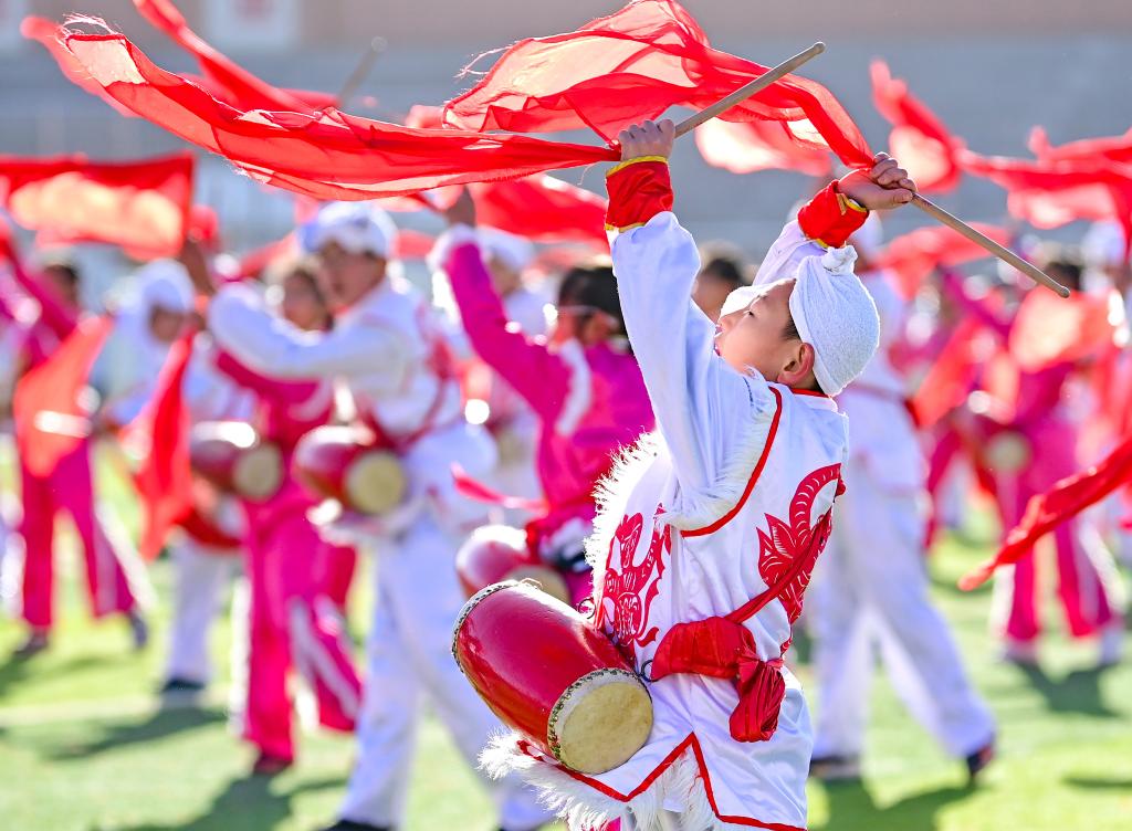 ??2023年11月16日,內(nèi)蒙古鄂爾多斯市鄂托克前旗第二小學(xué)的學(xué)生在大課間表演安塞腰鼓。該校將安塞腰鼓列入學(xué)校的校本課程和大課間活動(dòng),聘請(qǐng)民間藝人傳授技藝,讓非遺文化在校園中傳承。新華社發(fā)(王正攝)