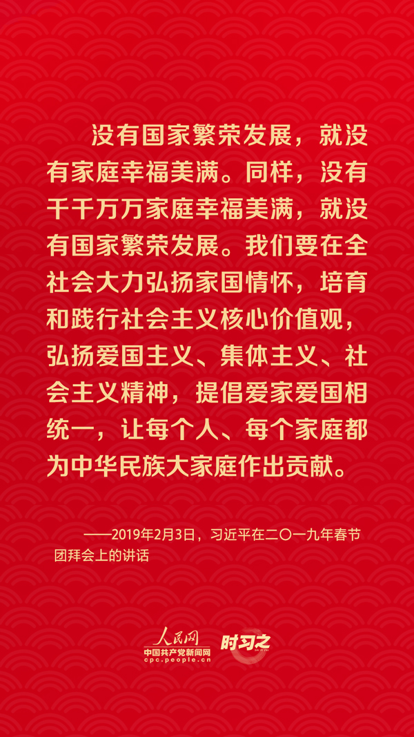 團(tuán)圓是春節(jié)永恒的主題?!皼](méi)有國(guó)家繁榮發(fā)展,就沒(méi)有家庭幸福美滿(mǎn)。同樣,沒(méi)有千千萬(wàn)萬(wàn)家庭幸福美滿(mǎn),就沒(méi)有國(guó)家繁榮發(fā)展?!绷?xí)近平總書(shū)記曾在多個(gè)場(chǎng)合深刻闡述家庭與國(guó)家之間的關(guān)系,從他的話(huà)語(yǔ)里一起感悟深厚的家國(guó)情懷。
