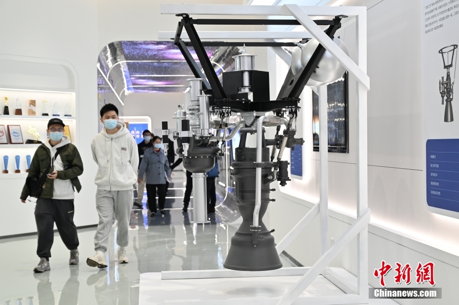 中科空天飛行科技產(chǎn)業(yè)化基地在廣州南沙投產(chǎn)。圖為中科空天飛行科技產(chǎn)業(yè)化基地展廳展示的液體發(fā)動(dòng)機(jī)模型吸引參觀者。 中新社記者 陳楚紅 攝