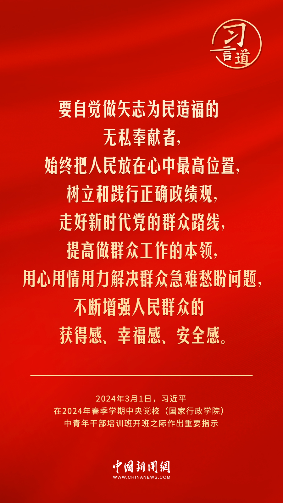 2024年春季學(xué)期中央黨校(國(guó)家行政學(xué)院)中青年干部培訓(xùn)班3月1日上午在中央黨校開班。中共中央總書記、國(guó)家主席、中央軍委主席習(xí)近平作出重要指示,他強(qiáng)調(diào)——