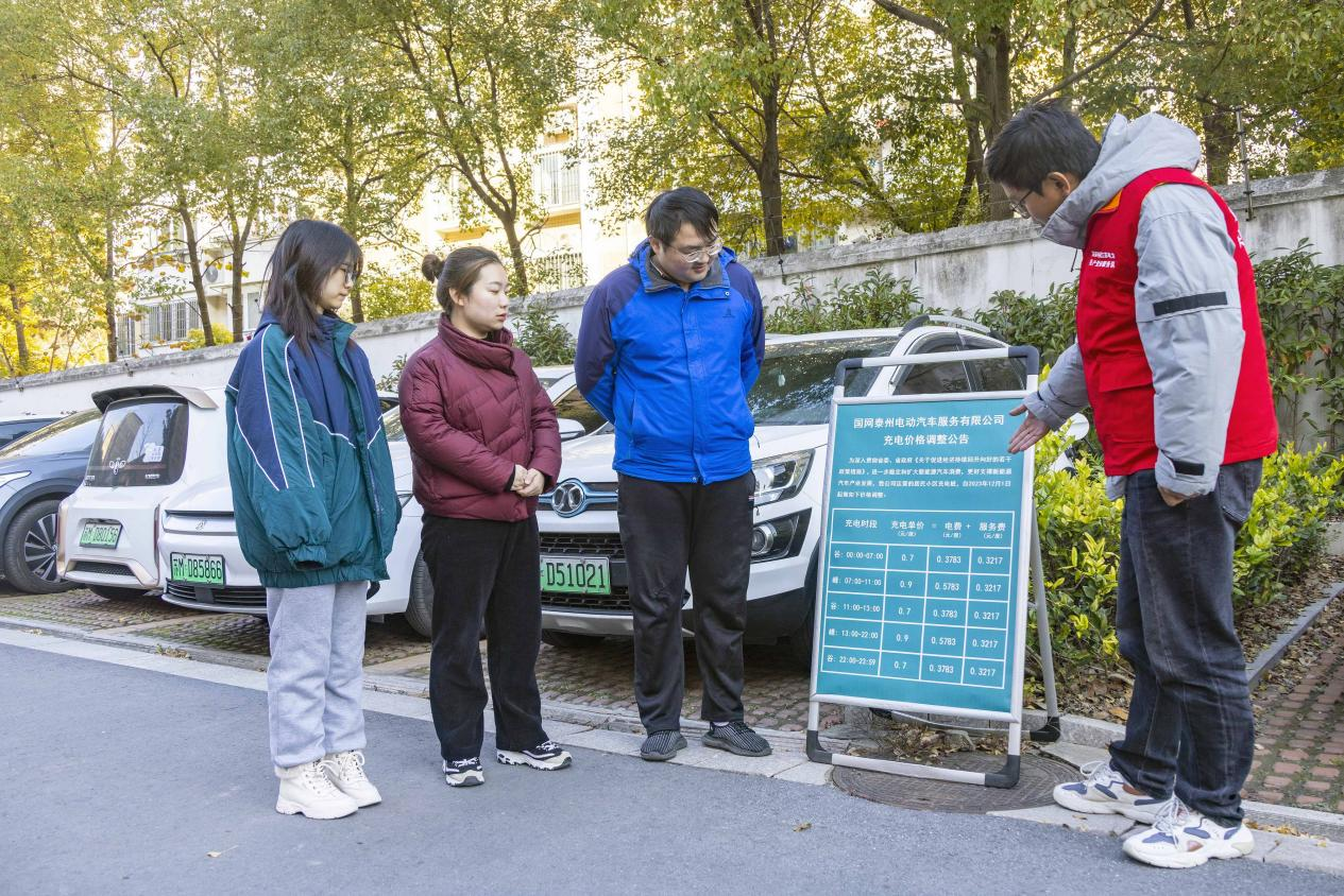 △ 2023年12月1日,工作人員在江蘇省泰州市蘇源花園二期居民區(qū)給車主講解執(zhí)行居民電價相關(guān)優(yōu)惠政策。