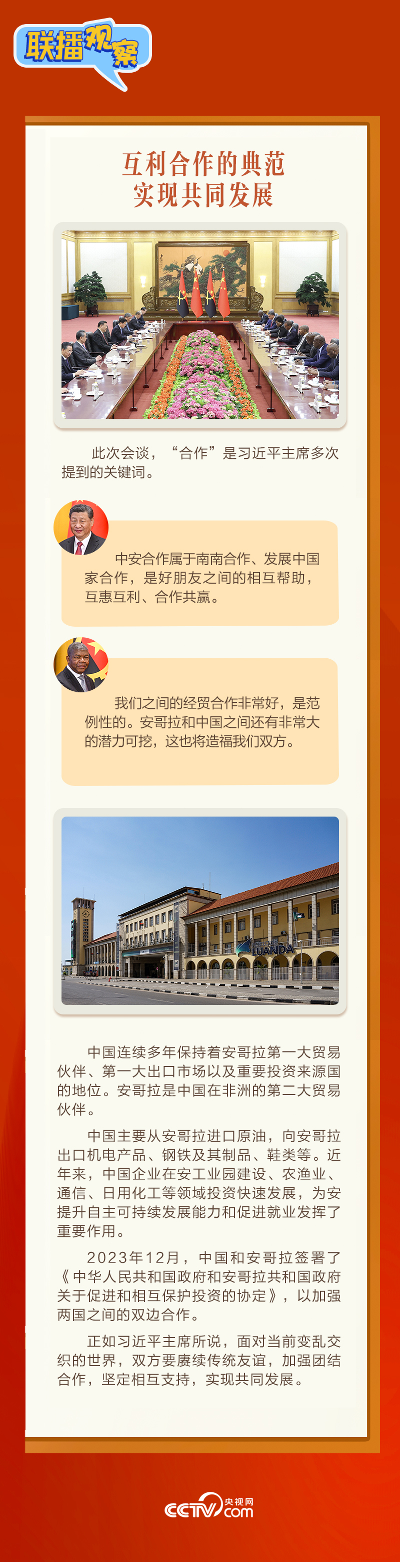 聯(lián)播+3月15日,習(xí)近平主席在人民大會(huì)堂同來(lái)華進(jìn)行國(guó)事訪問(wèn)的安哥拉總統(tǒng)洛倫索舉行會(huì)談。會(huì)談中,習(xí)主席稱(chēng)洛倫索總統(tǒng)為“中國(guó)人民的老朋友”,評(píng)價(jià)中安關(guān)系“歷經(jīng)國(guó)際風(fēng)云變幻考驗(yàn),實(shí)實(shí)在在造福了兩國(guó)人民”。