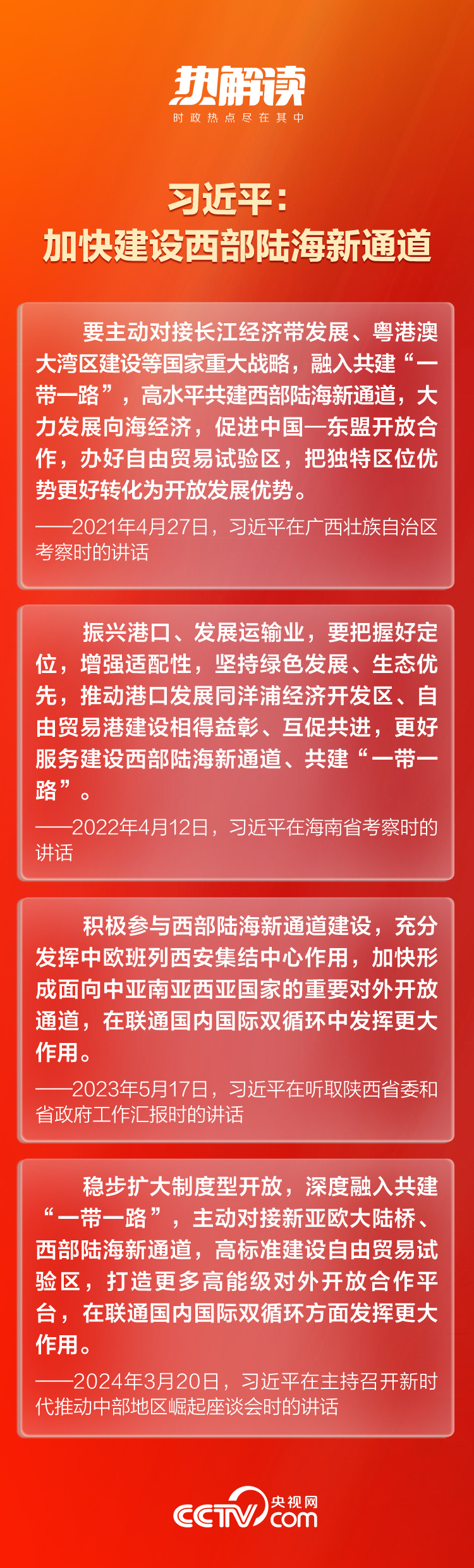 總書記一直對(duì)這條通道的建設(shè)十分關(guān)切。近年來(lái),總書記在貴州、陜西、廣西等西部陸海新通道沿線省區(qū)考察時(shí),多次對(duì)高水平共建西部陸海新通道作出重要指示。