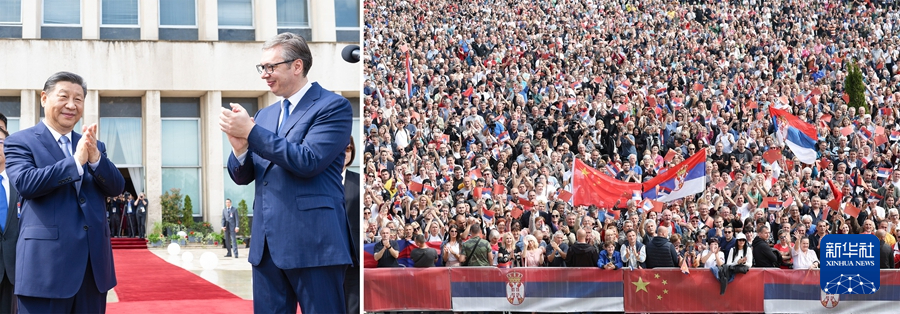 ??會(huì)談前,塞爾維亞總統(tǒng)武契奇陪同習(xí)近平主席來到大廈平臺(tái)。此時(shí),平臺(tái)外的大廈廣場上,友誼的海洋沸騰起來——一萬五千名當(dāng)?shù)孛癖姄]舞中塞兩國國旗,齊聲呼喊兩國國名,對遠(yuǎn)道而來的貴客表示最熱烈的歡迎。