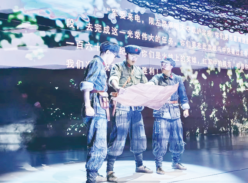 “同志們,跟我前進!”“以最快速度趕到瀘定橋,才是我們的首要任務……”舞臺大幕開啟,影像結合舞美形成一組巨型浮雕,在燈光的映照下,紅軍戰(zhàn)士堅毅的臉龐漸漸浮現,他們佇立在瀘定橋旁,目光如炬。燈滅,炮火聲從遠處傳來……這是大型原創(chuàng)舞臺劇《飛奪瀘定橋》中的場景,每天上午10時30分和下午3時,該劇在瀘定縣紅軍飛奪瀘定橋紀念碑公園內的紅軍劇場上演。偉大的長征是中國共產黨和紅軍譜寫的壯麗史詩,是中華民族偉大復興歷史進程中的巍峨豐碑。舞臺劇《飛奪瀘定橋》聚焦宏大歷史中的典型事件,以紅軍長征途中飛奪瀘定橋戰(zhàn)役為背景,以一個紅軍小號手的視角,生動講述紅四團晝夜奔襲240里,22名突擊隊員在槍林彈雨中踩著13根鐵索成功奪下瀘定橋的故事,藝術展現紅軍的堅定革命信念和必勝信心,讓觀眾在感動中重溫偉大長征精神。