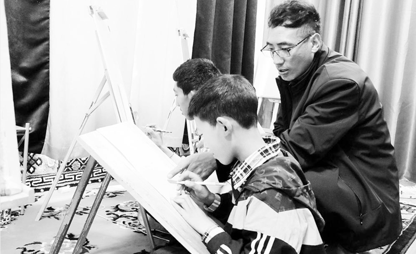 昂旺西繞在教小朋友繪制唐卡。