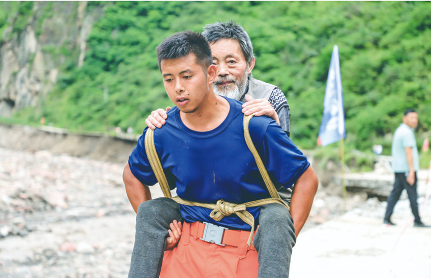 鹽水溪村71歲的村民倪月富,腰以下重度殘疾,行動極為不便,被困家中。關(guān)鍵時刻,村組干部及時前來轉(zhuǎn)移。由于轉(zhuǎn)移路線漫長,且沿途存在垮塌狀況,村黨員干部接力背送老人。