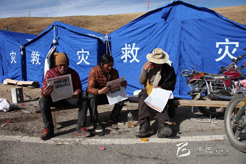 康定地震發(fā)生以來,前往災(zāi)區(qū)采訪的記者堅(jiān)持向?yàn)?zāi)區(qū)群眾帶去《甘孜日?qǐng)?bào)》藏漢文報(bào),讓群眾在安置點(diǎn)就能了解黨委、政府組織抗震救災(zāi)的情況。圖為江巴村民正在救災(zāi)帳篷外看報(bào)。 李慶林 攝影報(bào)道