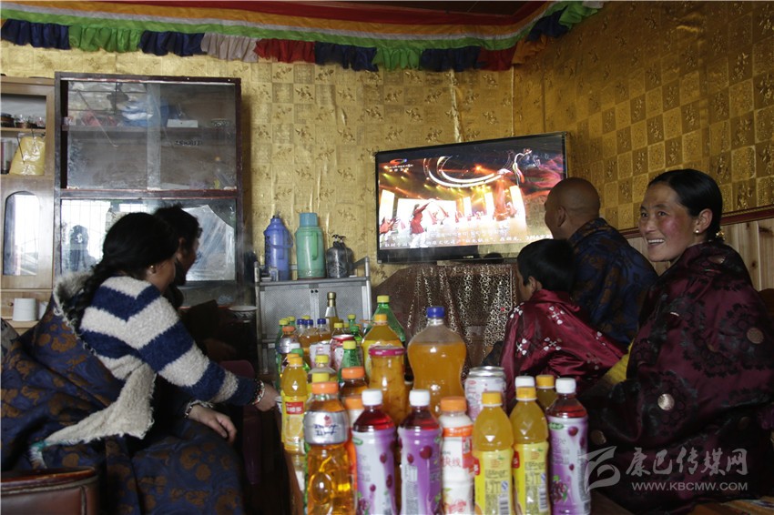 家里鋼爐中的火還在熊熊燃燒,滾燙的奶茶冒著陣陣香氣,藏桌上擺放的各種糖果、飲料和零食,顯現(xiàn)出這個(gè)牧民家庭已經(jīng)衣食無憂。50寸大彩電播放著精彩的文藝節(jié)目,讓這個(gè)家庭感受到了文藝帶給他們的快樂。眼前的一切,也讓記者在藏區(qū)牧民家中感受到了濃濃的年味。
