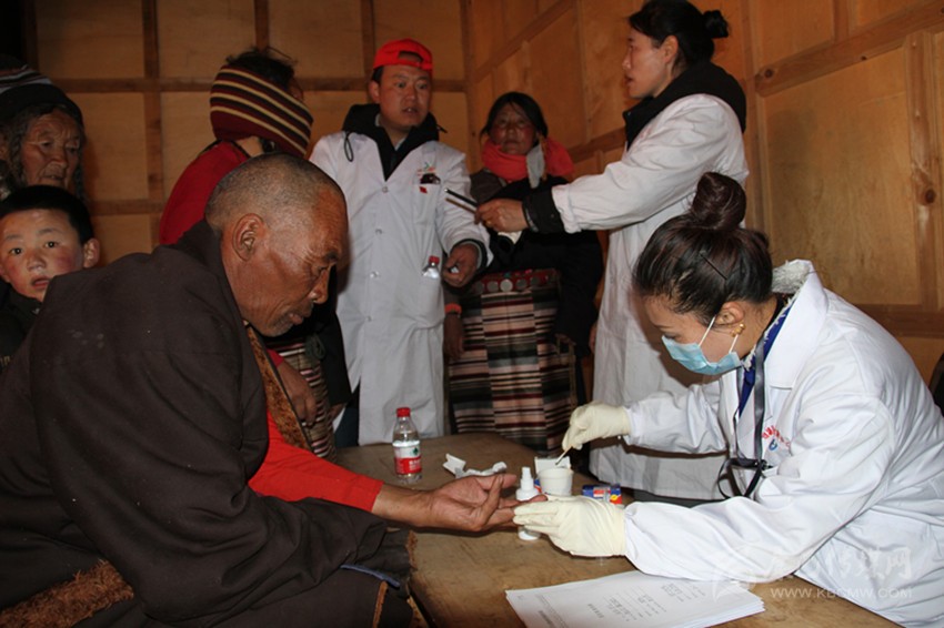 本網(wǎng)訊(葉強平)4月11日,理塘縣衛(wèi)計局組織19名醫(yī)務(wù)人員,深入離縣城60多公里、海拔4200多米的村戈鄉(xiāng)拖仁村,為90多名牧民群眾進(jìn)行了體重、血壓、B超、心電圖、婦女病篩查等健康檢查,還為群眾建立了健康檔案。圖為醫(yī)務(wù)人員在為牧民群眾測血糖。