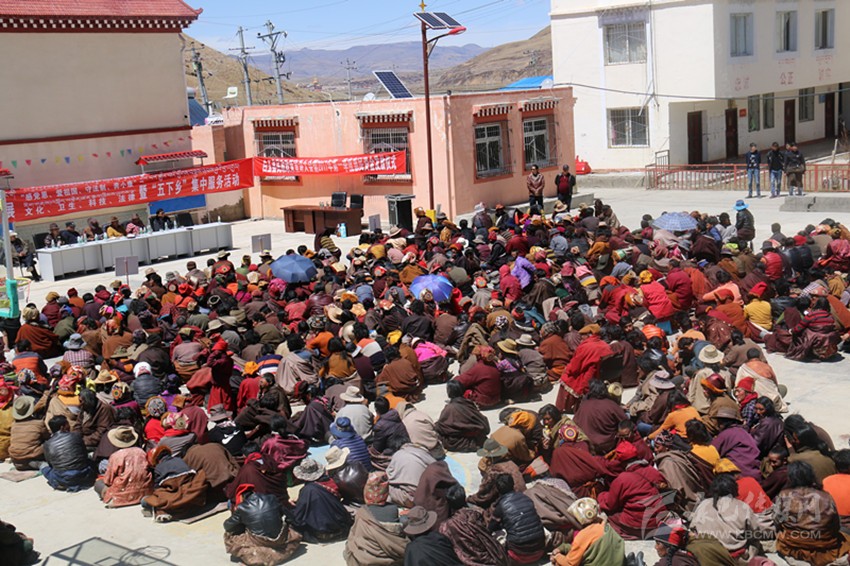白玉縣牧區(qū)納塔鄉(xiāng),高原烈日下,1000多牧民和僧人盤腿坐在地上,聚精會神聆聽,麥克風(fēng)里傳出抑揚頓挫的藏語,本地諺語、民間故事配合著扶貧政策、法律法規(guī),通過一個個生動的比喻,回響在牧民耳畔。