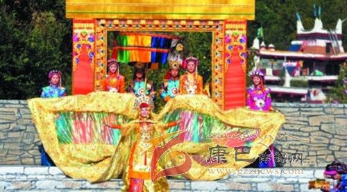 在催人奮進(jìn)的戰(zhàn)鼓聲中,一群身披甲胄的士兵拿著長(zhǎng)劍,背著巨弓走到臺(tái)前,在鏗鏘的戰(zhàn)鼓聲中,戰(zhàn)士們做著各種競(jìng)技動(dòng)作,模仿武士們互相攻擊的樣子,那矯健的身影展示了遠(yuǎn)古時(shí)代嘉絨藏族先民們?yōu)榱松媾c自然努力抗?fàn)幍膱?chǎng)景。過了一會(huì)兒音樂一轉(zhuǎn),戰(zhàn)鼓聲漸漸減弱,在鳥雀的陣陣啾啾聲中,一座木門慢慢的開啟,一位身披長(zhǎng)袍、頭戴鳳冠的女王在眾多美女的簇?fù)硐?,緩緩走下臺(tái)階步入舞臺(tái)中央,此時(shí),一位手捧托盤的老者來到女王面前單膝下跪,將托盤高舉過頂,并邀請(qǐng)女王品嘗佳肴,女王將中指在酒中蘸了蘸,并曲起中指向四周輕輕彈去,寓意愿將杯中美酒與四方百姓同飲。在女王面前還放置著一個(gè)凈水桶,桶中盛滿了清澈的甘泉,桶上橫放著一枝柏樹枝,女王伸出纖纖玉手,拿著柏樹枝在水中蘸了蘸,面向墨爾多神山撒去,寓意向神山祈福。這是此次《美人谷·丹巴》節(jié)目展演中的序曲部分,有著強(qiáng)烈的東女神韻,將遠(yuǎn)古時(shí)代東女國(guó)女王遺風(fēng)展演的淋漓盡致。