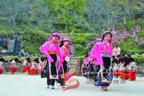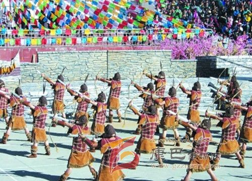 10月26日,在甲居藏寨,處處洋溢著豐收和歡樂的氣氛,人們扶老攜幼,身著節(jié)日的盛裝走到一起,來共同慶祝丹巴嘉絨風(fēng)情節(jié)的順利召開。在一塊空地中,搭建了臨時(shí)的舞臺(tái),看臺(tái)上,幾座古碉模型傲然挺立,在不遠(yuǎn)處,一座古碉矗立在一座小山包上,與古碉模型遙相呼應(yīng)、相映成趣。上午9時(shí)40分,當(dāng)節(jié)目主持人宣布嘉絨風(fēng)情節(jié)正式開始時(shí),一束束搖曳的煙花向空中飛去,在空中炸響后,散發(fā)出五顏六色的煙霧,其中有的還幻化成幾多小小的降落傘,就像多多盛開的鮮花在空中綻放。演出現(xiàn)場(chǎng)前的大地和遠(yuǎn)處的小山坡上到處都站滿了熱情的觀眾,合著禮花的爆裂時(shí)的響聲,將手中的小紅旗展開,高舉過頭頂,有節(jié)奏的左右搖動(dòng),霎時(shí)間,整個(gè)現(xiàn)場(chǎng)成為了紅色的海洋。
