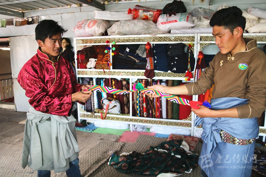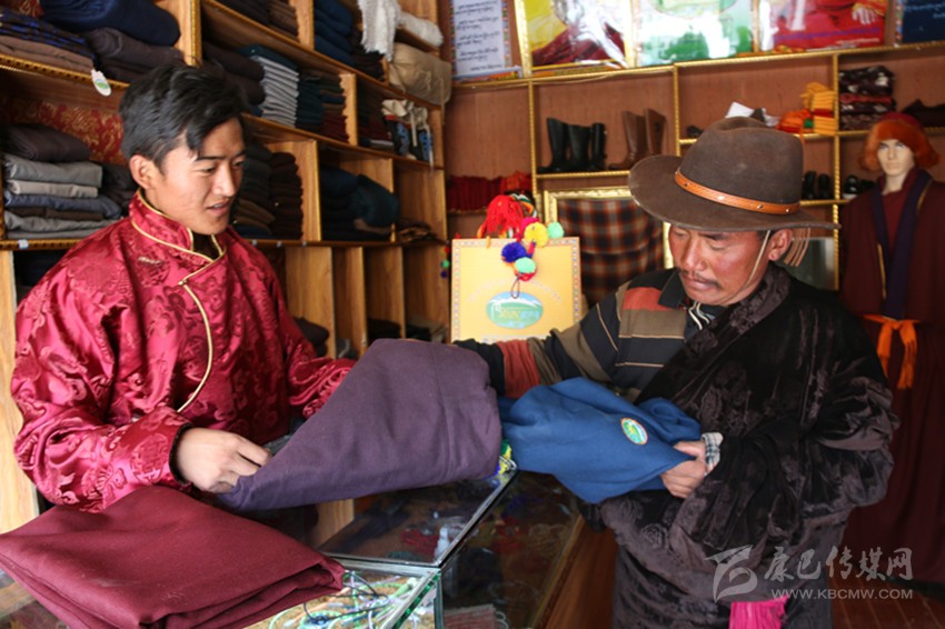 安孜鄉(xiāng)作為白玉縣海拔較高的鄉(xiāng)鎮(zhèn)之一,夏天是十分短暫的,連日來(lái)的晴好天氣,也透著絲絲寒氣。牧民阿剛想要量身定做一套過(guò)冬的藏裝,8月26日,他來(lái)到白玉縣阿察鎮(zhèn),一家民族服飾商貿(mào)公司吸引了他的目光?!拔覀冞@里的服裝面料是本地羊毛和從浙江進(jìn)的上等面料,做工考究,很多工序是純手工制作,服裝樣式你可以根據(jù)你的喜好指定,我們包你滿意?!钡陠T仁真熱情地介紹。聽(tīng)了仁真的介紹,阿剛用手捻了一下服裝用料的質(zhì)地,看到印有“祥陽(yáng)措”商標(biāo)的精美包裝袋,商店里擺放的五彩斑斕、高端大氣的藏式男女服裝,他有些動(dòng)心了?!吧a(chǎn)這些服裝的都是我們納塔鄉(xiāng)的牧民,你可以考察我們的服裝用料、生產(chǎn)流程,再作打算?!比收鏌崆檠笠绲亟榻B說(shuō)。