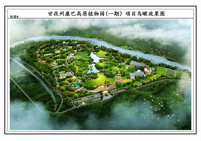 甘孜州康巴高原植物園(一期)項(xiàng)目鳥瞰效果圖。