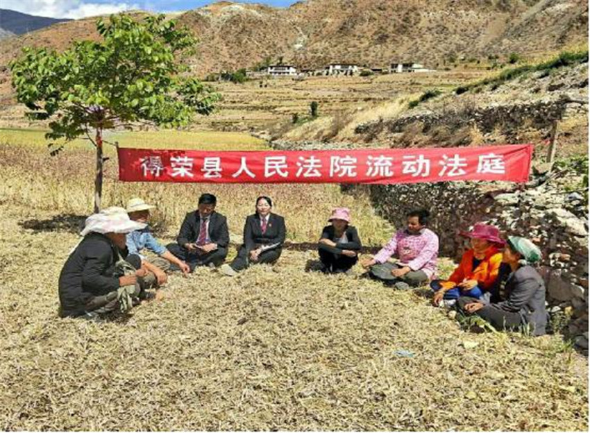 在曲雅貢鄉(xiāng)二號壩村進行法律宣講時,村民澤某請求法院判決其和丈夫扎某離婚,“流動法庭”法官立即在田間地頭組織調(diào)解。調(diào)解過程中當事人情緒抵觸、相互埋怨,尤其涉及到財產(chǎn)分割和子女撫養(yǎng)等問題時情緒波動大,場面一度僵持。法官憑借豐富的調(diào)解經(jīng)驗,先從講解相關(guān)法律規(guī)定入手,告知當事人享有的權(quán)利義務,而后對離婚財產(chǎn)分割、子女撫養(yǎng)問題從情理法多角度層層剖析,促使雙方達成和解協(xié)議,有效化解了矛盾?!傲鲃臃ㄍァ币孕僬{(diào)、以案說法,達到了審理一案、教育一片、穩(wěn)定一方的效果。