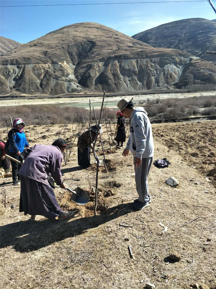 4月,正是高原植樹栽花的好時節(jié),溫暖的陽光把鮮水河兩岸照耀得一片金黃,斯木鎮(zhèn)俄米村的30多位村民在早晨的陽光下熱火朝天地栽著種根徑超過0.05米的5年樹齡、高達2米的杏樹,有人用鋤頭清坑,有人用鐵鏟培土,有人躬身用臉盆澆水,從青海移栽到爐霍的杏樹,將在明年的今天為爐霍帶來杏花的海洋。
