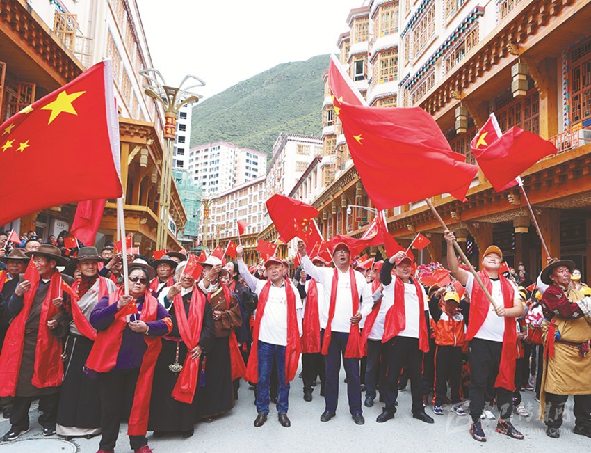 伴隨著悠揚(yáng)的旋律,在當(dāng)?shù)馗袼_爾藝術(shù)團(tuán)演員的帶領(lǐng)和感染下,幾千名當(dāng)?shù)馗刹咳罕娚碇A服,揮舞著手中的五星紅旗,懷著無(wú)比激動(dòng)的心情獻(xiàn)歌祖國(guó),同唱《我和我的祖國(guó)》。深情激昂的歌聲感染到在場(chǎng)的每一個(gè)人,有的高呼喝彩、有的熱淚盈眶,齊聚在鮮紅的國(guó)旗下,齊聲高喊:“我愛祖國(guó),祖國(guó)萬(wàn)歲!”