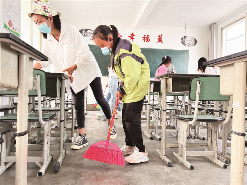 在學校一樓走廊,記者看到墻壁上貼滿了孩子們自制的民族團結手抄報和五十六個民族一家親的畫作。瀘定橋小學副校長杜德琴告訴記者,這是學校開展鑄牢中華民族共同體意識主題教育實踐活動的內容之一?!斑@些都是老師、家長和學生一起完成的,‘團結’與‘奮進’已深深印刻在瀘定橋小學每一個人的言行中,我們是愛的傳遞者,我們是在以實際行動踐行校訓。我希望災區(qū)的孩子們能盡快走進學校,繼續(xù)學業(yè)。”