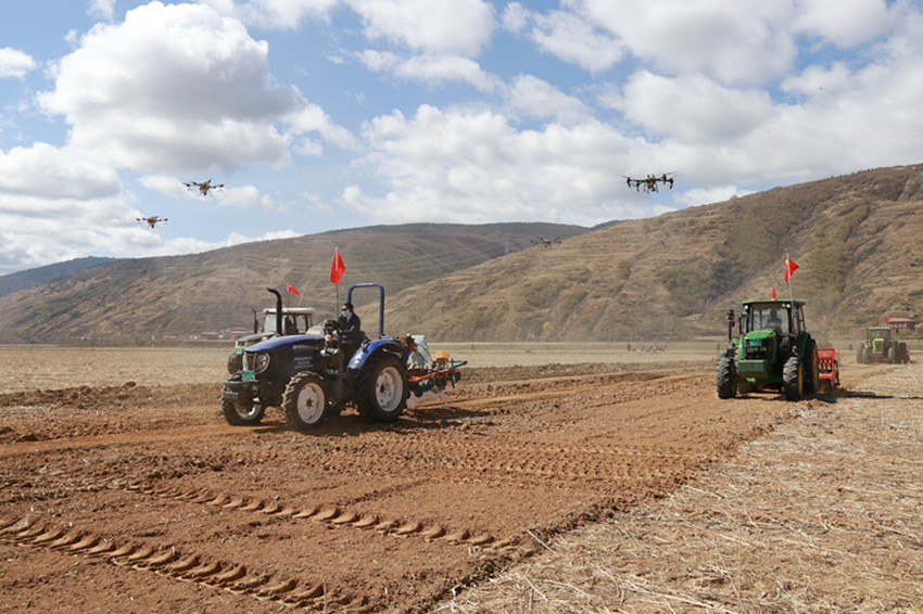 隨著一聲擲地有聲的“開耕……”,十余輛大型農(nóng)機(jī)具緩緩入地,現(xiàn)場(chǎng)為大家展示了青稞全程機(jī)械化作業(yè)。20臺(tái)免耕播種機(jī)、約翰迪爾1354輪式拖拉機(jī)等機(jī)具在農(nóng)機(jī)手熟練操控下,旋耕、播種、覆土、鎮(zhèn)壓一次完成,無人機(jī)飛舞在天空,噴灑著農(nóng)藥,一幅現(xiàn)代版鐵牛“春耕”競(jìng)技圖躍入眼簾,在場(chǎng)人員紛紛掏出手機(jī)、相機(jī)拍攝記錄下這富有“科技感”的畫面。