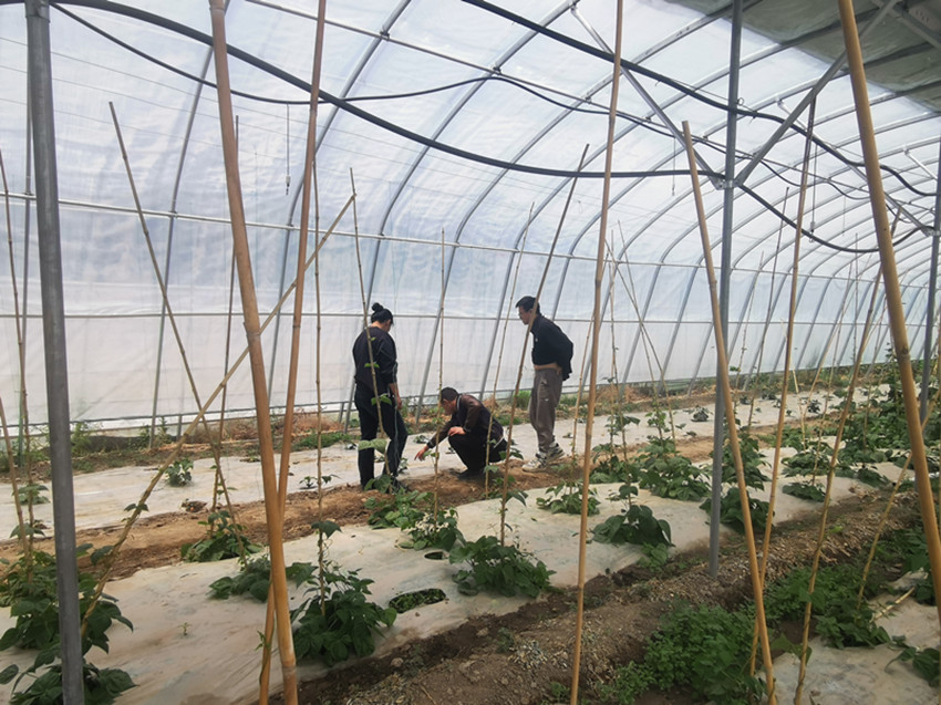 農(nóng)技員在蔬菜大棚指導(dǎo)農(nóng)戶進(jìn)行科學(xué)管護(hù)。