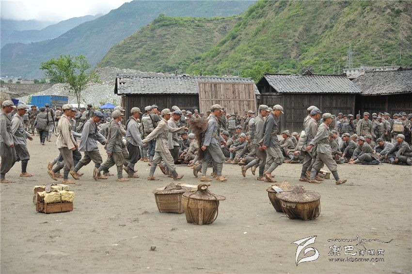 在大渡河邊,一座“安順場(chǎng)”搭建完成,一隊(duì)隊(duì)紅軍戰(zhàn)士來(lái)往穿梭,導(dǎo)演寧海強(qiáng)正在現(xiàn)場(chǎng)指揮拍攝。