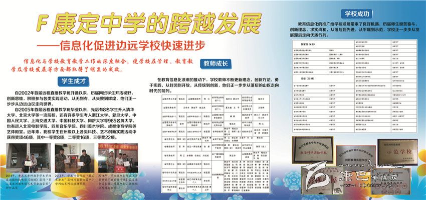 2002年以來(lái)康定中學(xué)立足民族地區(qū)教育實(shí)際,依托成都七中優(yōu)質(zhì)教育,先后開通成都七中高中直播班、初中錄播班,建成初中遠(yuǎn)程直錄播教學(xué)AB平臺(tái),實(shí)現(xiàn)了與國(guó)內(nèi)名校共享優(yōu)質(zhì)教學(xué)資源的目標(biāo),將網(wǎng)課教學(xué)打造成學(xué)校教育品牌。經(jīng)過(guò)近5000名師生員工的不懈努力,2013年來(lái),康定中學(xué)連續(xù)4年高考硬上本科人數(shù)突破200人大關(guān)。先后有8名學(xué)生被北京大學(xué)和清華大學(xué)錄取。中考綜合評(píng)比連續(xù)9年保持全州第一。