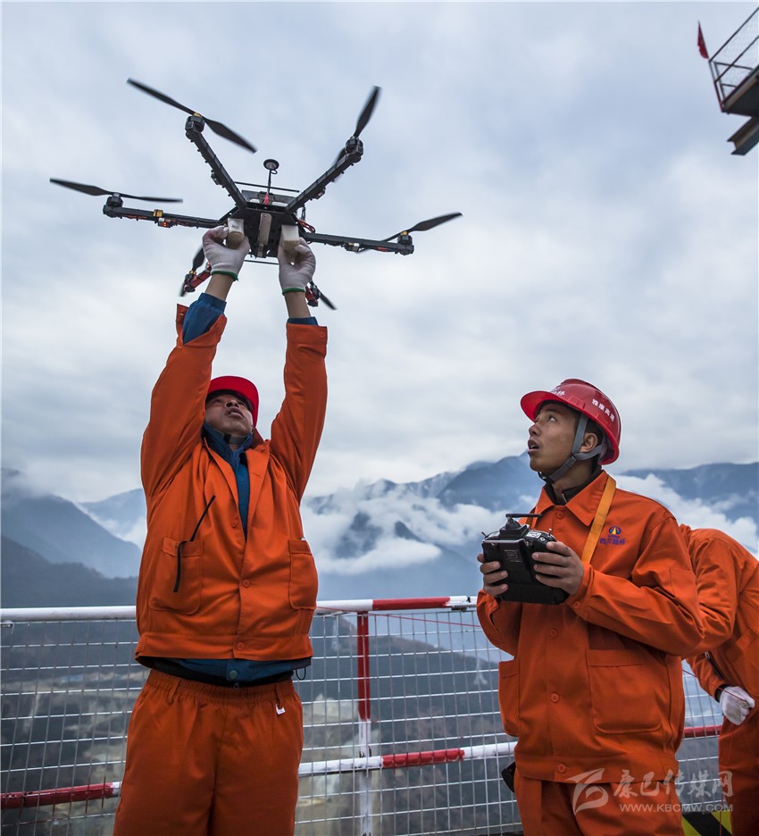 無(wú)人機(jī)將小繩送到對(duì)岸,工作人員再利用小繩拉大繩,最后把鋼繩拉過(guò)大渡河架設(shè)牽引系統(tǒng)。