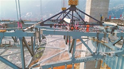 無(wú)人機(jī)先牽引一根2毫米“韓國(guó)絲”(韓國(guó)進(jìn)口的強(qiáng)韌性尼龍繩)布設(shè)兩岸橋塔,然后在2毫米“韓國(guó)絲”的“幫襯”下布設(shè)4毫米“韓國(guó)絲”,再到6毫米“韓國(guó)絲”,又到8毫米“韓國(guó)絲”,在這種相互“提攜”下布設(shè)上下各1根32毫米鋼索形成牽引系統(tǒng),用拽拉器布設(shè)錨道,進(jìn)行兩根主纜施工。主纜直徑達(dá)76厘米,由187股鋼繩組成,每根鋼繩由91根直徑5.3毫米長(zhǎng)度1700米的特性鋼絲構(gòu)成,兩根主纜所用鋼絲總長(zhǎng)達(dá)60000千米,可繞地球一周半