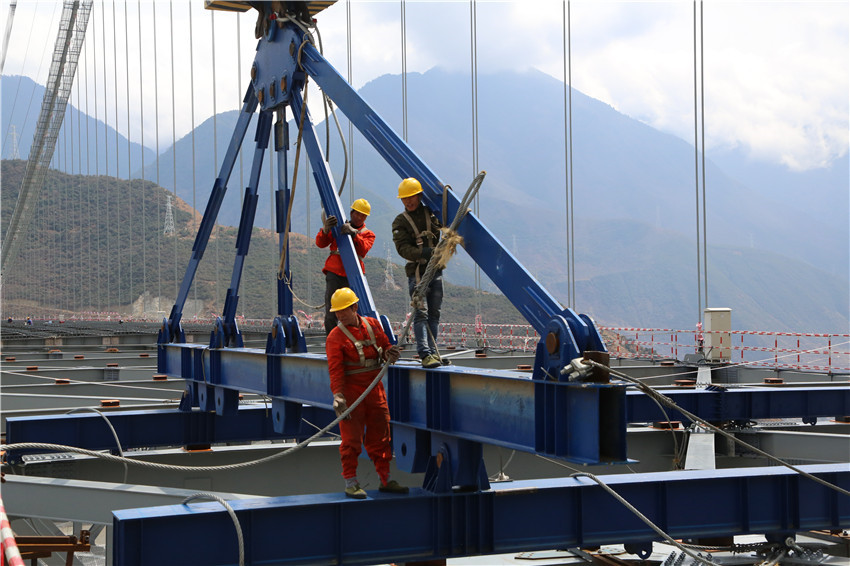興康特大橋作為高海拔、高地震烈度山區(qū)和復雜風場環(huán)境下世界第一超大跨徑鋼桁梁懸索橋,面臨的最現(xiàn)實的困難就是復雜風場。4月1日下午,大橋建設現(xiàn)場連綿不絕的大風如期而至,工人們系上安全繩,迎著大風,對新吊裝的材料一個螺絲一個螺絲的擰緊。