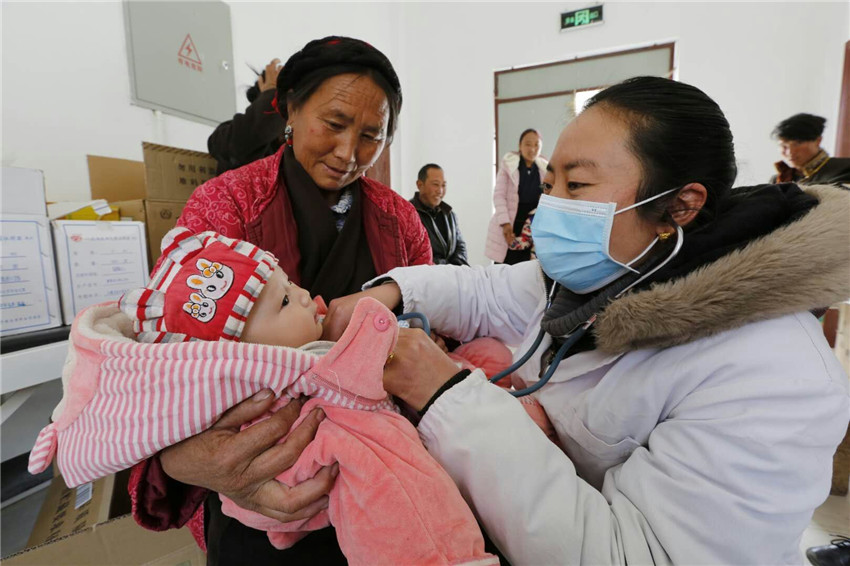 譚曉琴為兒童檢查身體。