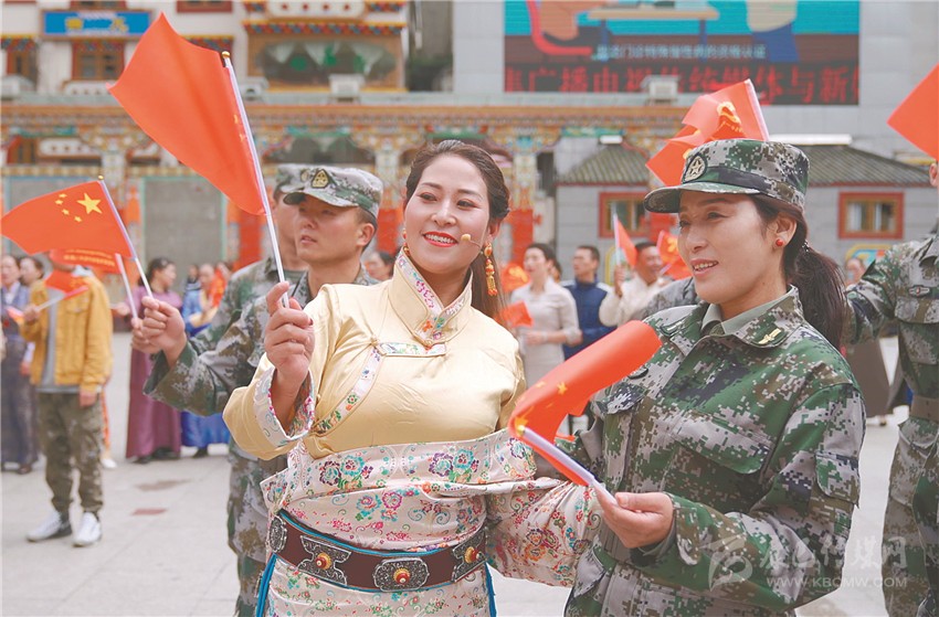 當(dāng)日下午2時(shí)許,“康定溜溜調(diào)”省級(jí)非物質(zhì)文化遺產(chǎn)傳承人毛云剛緩步走到廣場(chǎng)中間的建州七十年主題景觀“鍋莊篝火”旁邊,一段原生態(tài)山歌隨即從他口中傳出?!芭荞R山上青松林,心上的人兒.....”仿佛從歷史深處走來(lái)的情歌,立刻吸引到游人和散步市民駐足聆聽。隨后,其美多吉和歌手們走向主題景觀,唱響名揚(yáng)全球的《康定情歌》,身著制服的各行業(yè)工作人員,循著歌聲不約而同走向廣場(chǎng)中央,青年志愿者們?yōu)榫蹟n上前的人們發(fā)放小國(guó)旗和印有“建州70年Logo”的小紅旗......