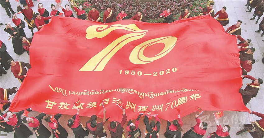 美妙的歌聲縈繞四方,鮮艷的旗幟迎風(fēng)飄揚(yáng)。就在眾人忘情高歌之時(shí),來(lái)自州歌舞團(tuán)的50多名演員將一面巨大的印有“建州70年Logo”的紅旗,在廣場(chǎng)正中鋪展開來(lái)。以這面旗幟為中心,先后到來(lái)的人們組成了三個(gè)同心圓,用歌聲禮贊甘孜州建州70周年。