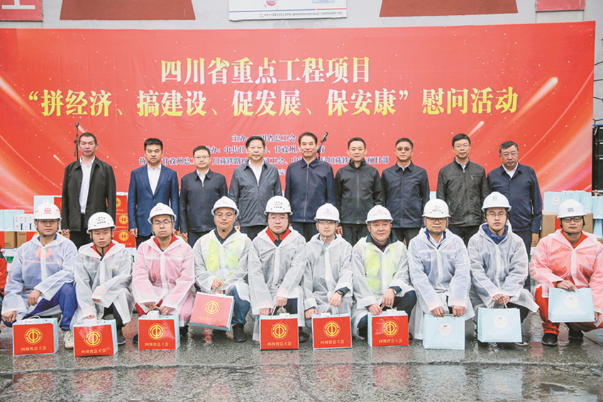 省委常委、統(tǒng)戰(zhàn)部長(zhǎng)趙俊民(左五),州委書記沈陽(yáng)(右四)等領(lǐng)導(dǎo)赴甘孜州重點(diǎn)工程項(xiàng)目開展“拼經(jīng)濟(jì)、促發(fā)展、保安康”慰問活動(dòng)。