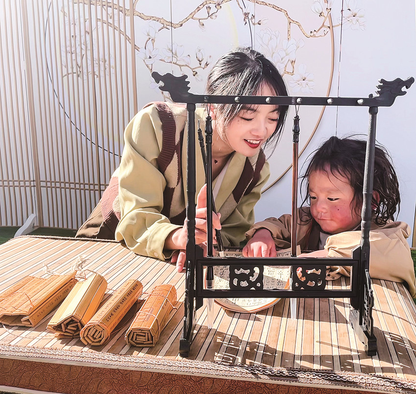卓妍雅教孩子寫書法。