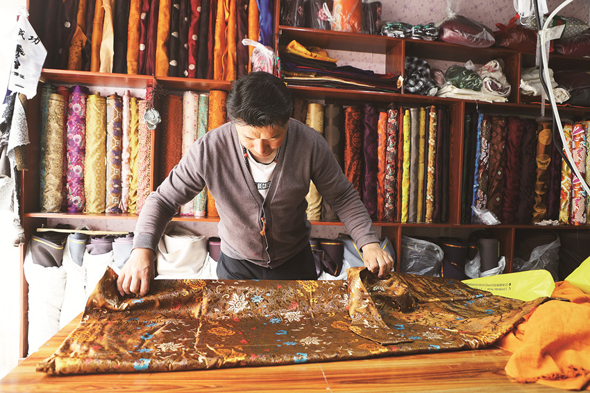 “傳統(tǒng)藏裝需要手工制作,青年、中年、老年人的款式各不一樣,料子也很有講究,還有裝飾也很重要……”說起登龍服飾,扎西澤仁神采飛揚,不時發(fā)出爽朗的笑聲,他說,“一般簡單的服裝制作僅需半天,復雜一些的要兩三天,價格從幾百元到幾千元不等?,F(xiàn)在縣城的商店生意很好,每天都能接到很多訂單,在登龍鄉(xiāng)的鋪子交給徒弟打理也完全沒有問題?!?/span>
