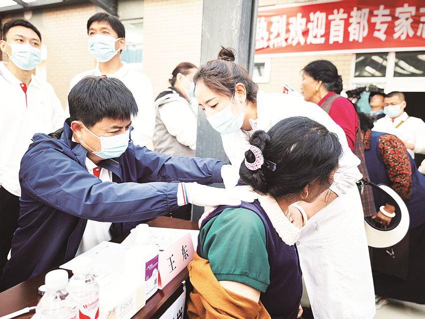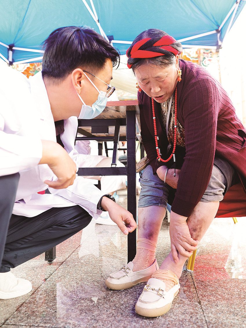 排隊、分診、診斷……在巴塘縣義診現(xiàn)場,每一位身著白衣、口音輕柔的醫(yī)生面前都有數(shù)名等待問診的群眾。來自北京大學(xué)第一醫(yī)院、解放軍第八醫(yī)學(xué)中心、北京航天總醫(yī)院等醫(yī)療機構(gòu),涵蓋腎臟、中醫(yī)、骨科、肝病科疾病等多個領(lǐng)域的專家團(tuán)隊正為前來問診的群眾提供多學(xué)科專業(yè)義診服務(wù),并就常見疾病耐心細(xì)致地為患者及家屬答疑解惑。