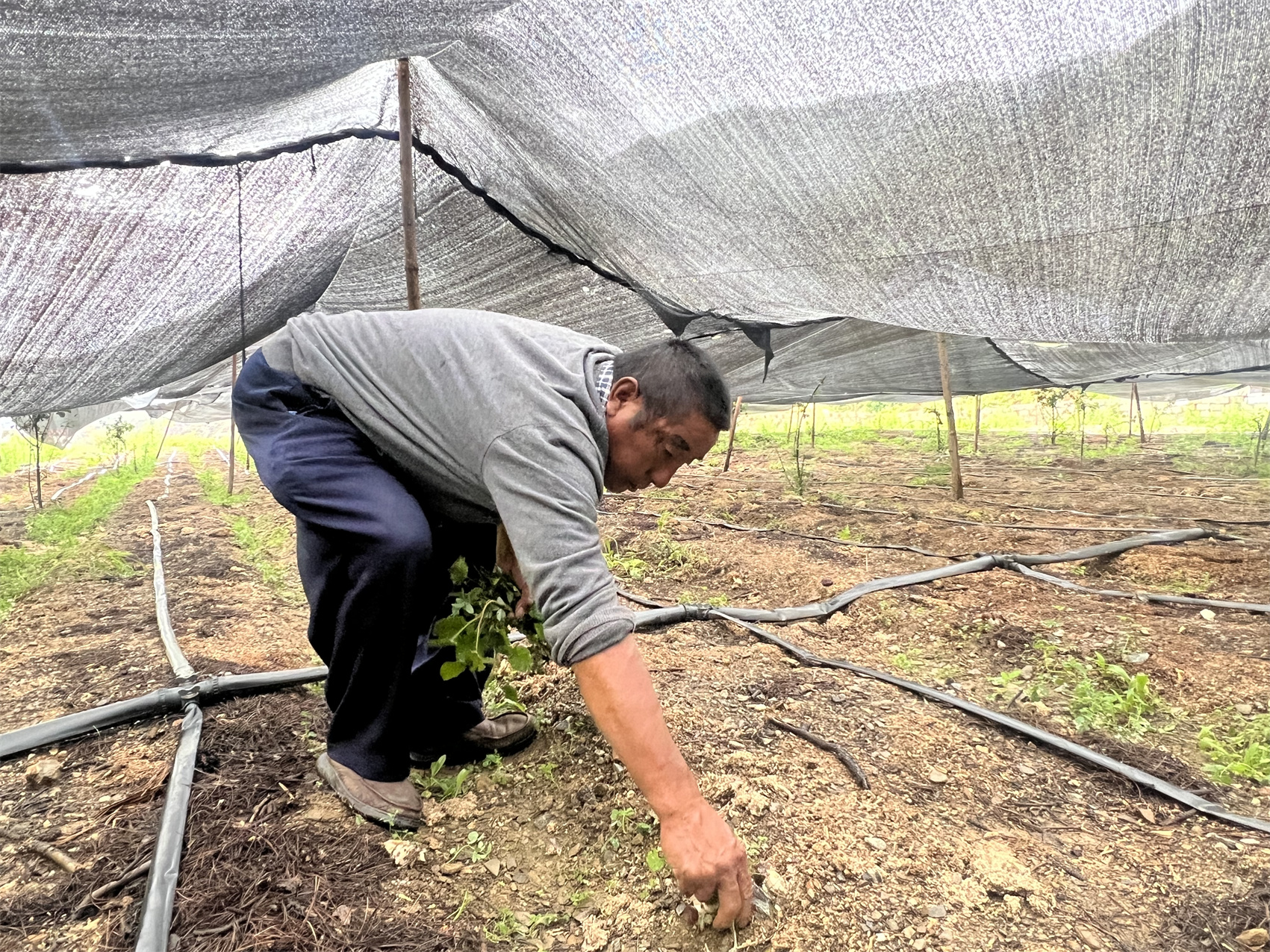 洛絨鄧朱在食用菌大棚內(nèi)除草。