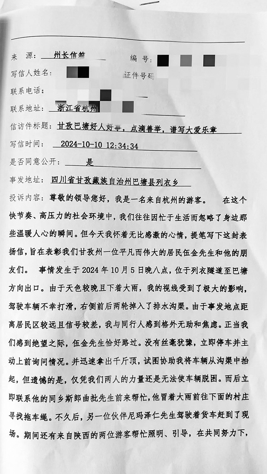 “這次旅行,我們對巴塘的印象非常棒,景色優(yōu)美,民風(fēng)善良淳樸。遺憾的是,由于當(dāng)時情況緊急,我們未能與那些伸出援手的好人們合影留念?!卑踩摾Ш?,杜先生提出以現(xiàn)金的形式向伍金幾人表示感謝,但都被幾人拒絕。返回家鄉(xiāng)后,杜先生一行對發(fā)生在巴塘的這一暖心故事依然久久難以忘懷,一幕幕場景仿佛在眼前重現(xiàn)。為了表達(dá)內(nèi)心最真摯的感激之情,杜先生特地通過甘孜州人民政府的官方網(wǎng)站,向“州長信箱”投遞了一封飽含深情的感謝信。