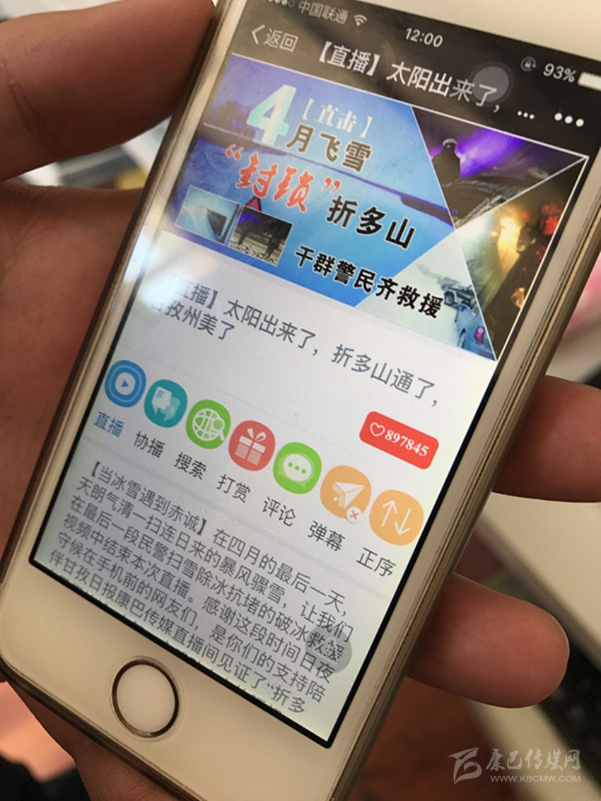 5月2日,隨著5.1小長假結(jié)束,甘孜日報對折多山突降大雪、引發(fā)交通堵塞的立體式報道告一段落,作為突發(fā)災(zāi)害性天氣,甘孜日報行動迅速,傳統(tǒng)媒體、掌上直播、康巴微信、甘孜發(fā)布等全媒體齊上陣,掌上直播《4月飛雪“封鎖”折多山,干群警民齊救援》,以其即時消息、圖片、視頻等海量信息,引發(fā)點(diǎn)擊“狂潮”,不到兩個小時,點(diǎn)擊量即超過35萬人次,至小長假結(jié)束,點(diǎn)擊量近百萬人次;康巴傳媒微信《4月飛雪,千人馳援》點(diǎn)擊量超12萬人次;甘孜日報社對折多山大雪現(xiàn)場立體交叉式直播被新華社、中國新聞網(wǎng)、華西都市報封面新聞、網(wǎng)易新聞頻道等州外媒體分別轉(zhuǎn)載或引用相關(guān)報道。我州應(yīng)急措施有力、有序,得到眾多媒體和網(wǎng)友紛紛點(diǎn)贊。州委常委、宣傳部長相洛稱贊甘孜日報在這次直播中,行動迅速、引導(dǎo)有力,既客觀報道了突發(fā)性災(zāi)害天氣對我州交通和旅游帶來的不利影響,更突出報道了我州和康定市采取的各項(xiàng)應(yīng)急措施,是一次媒體融合的有益嘗試。