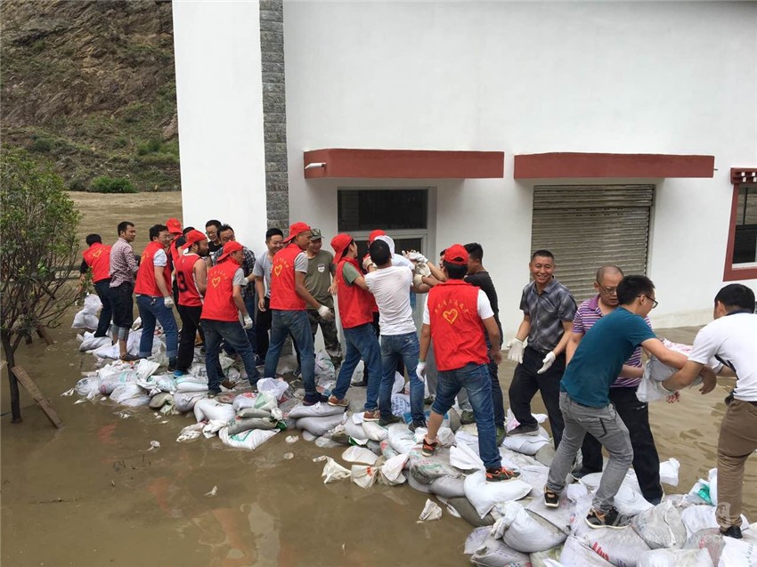 志愿者正在丹巴縣抗洪現(xiàn)場(chǎng)搬運(yùn)沙袋。